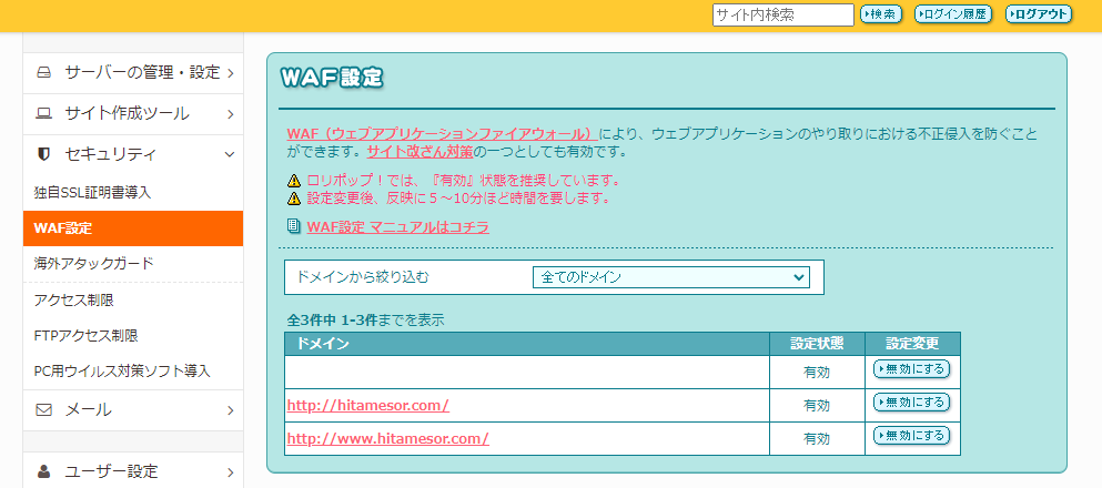 ロリポップのサーバー利用者のかたはWAF設定を有効にもどすことを忘れずに行ってください。