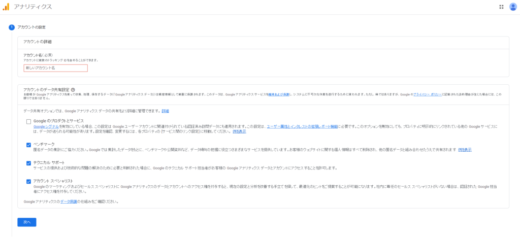 必須入力であるアカウント名に管理しやすい名前を入力します。アカウントのデータ共有設定タブのチェック項目は必要に応じて選択してください。終えれば次へボタンを押します。