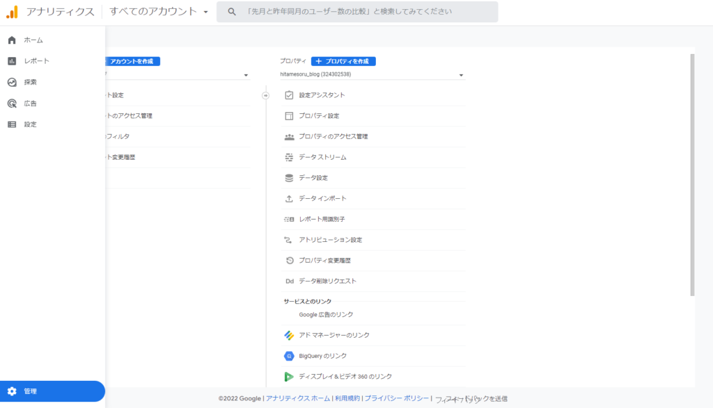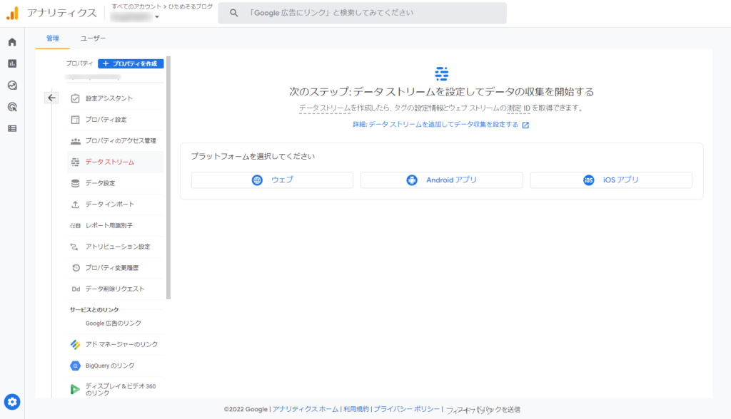 アカウント取得後、間違えて他の画面へ移動してしまったら、アナリティクスホーム画面の左下にある歯車アイコンの管理をクリックし次にデータストリームを選択すると再び測定IDの取得画面へ戻れます。