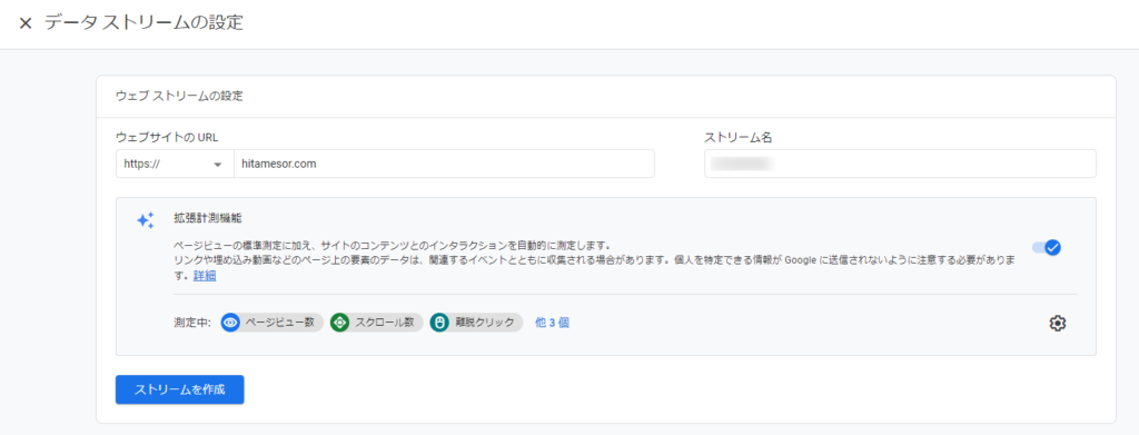 Google アナリティクスで解析したいウェブサイトのURLを入力し、アナリティクスの管理画面で表示されるストリーム名も入力します。ストリーム名は名札のようなもので解析自体に影響がありませんが、作成後に名前は変更できませんので注意してください。